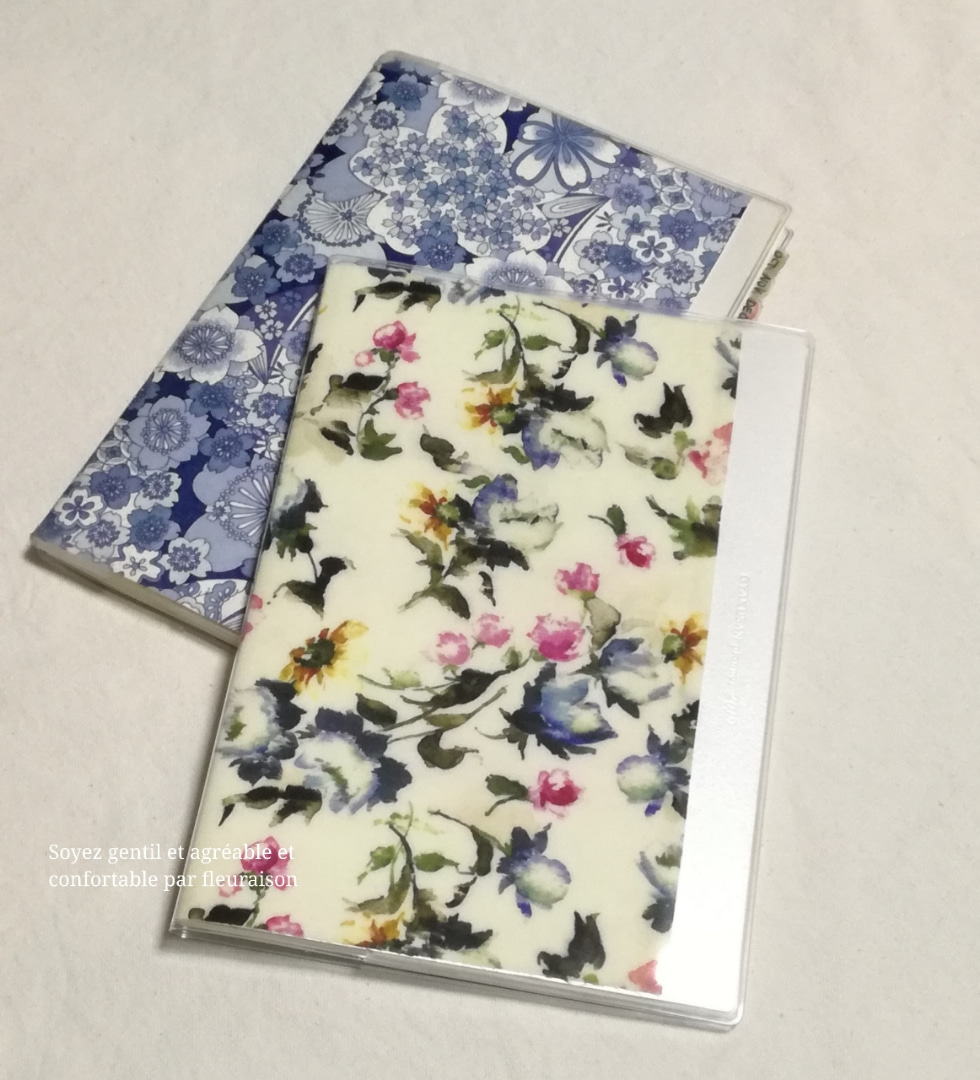 2018年版はブルーを基調とした友禅和紙を使って、頭が冴える色使いを意識しましたが、2019年版は、リバティーのクロスに薄手の接着芯を貼って、女性らしく彩豊かな色使いを意識しています。