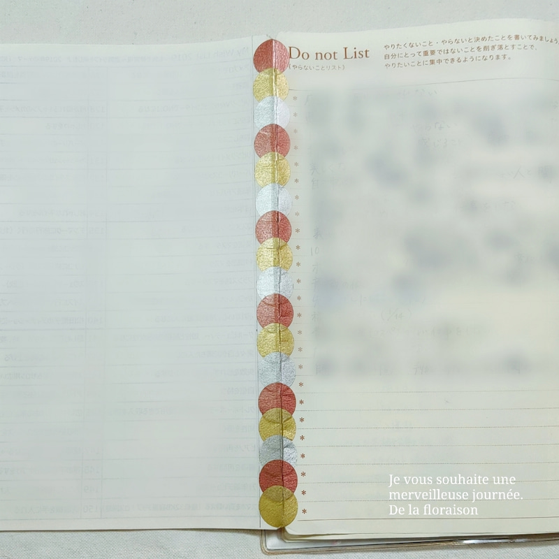 あとは、金銀銅の丸シールなどをつなげてページを付け足したり。